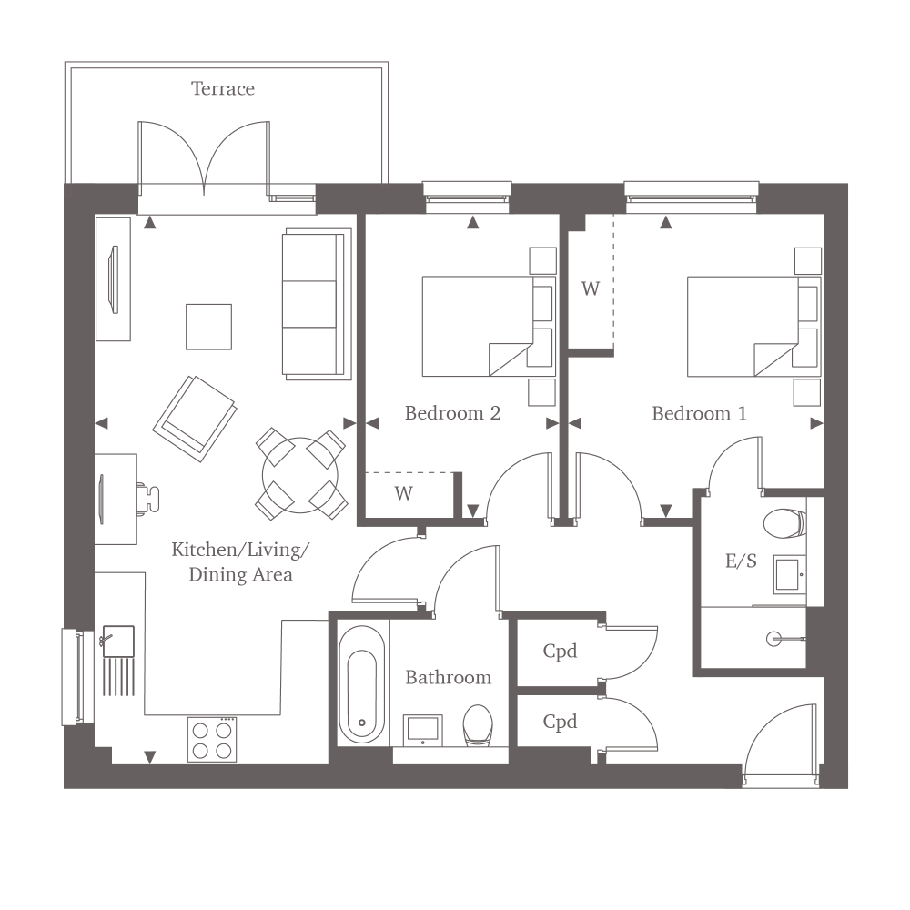 Point from which maximum dimensions are measured. Dimensions are intended for guidance only and may vary by plus or minus 7.6cm/3", The plots indicate general layout only which may vary from other plots. Kitchen and bathroom layouts indicative only. W denotes wardrobe. Cpd denotes cupboard. E/S denotes ensuite, W/S denotes workstation. — denotes porch. (h) denotes handed. Please contact Sales Consultant for more information.